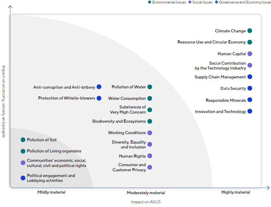 For material issues, ASUS has established its management policies and formulated action plans and set targets and indexes based on the digitalized measurement strategies to periodically track the achievements. For other issues that are not material, we disclose existing management procedures and measures for stakeholders to understand the overall sustainability achievements of ASUS.